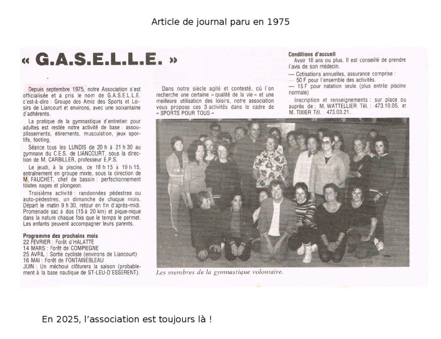Au début des années 70, des amis liancourtois se sont réunis pour partager leur envie de créer une association dédiée à la pratique de l’activité physique ; élément si essentiel à la bonne santé et à la bonne humeur. La « gymnastique volontaire » ou « gymnastique d’entretien » devenait en vogue à l’époque. Sous l’impulsion de Gérard Wattelier et Maurice Tixier, l’association prit forme.